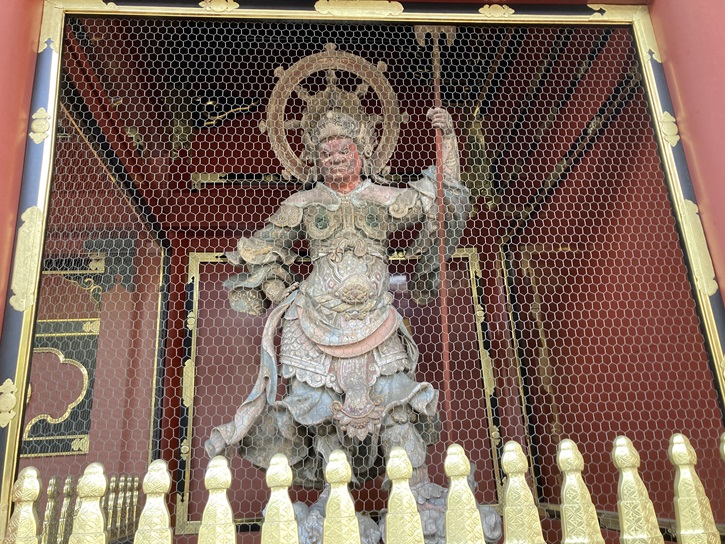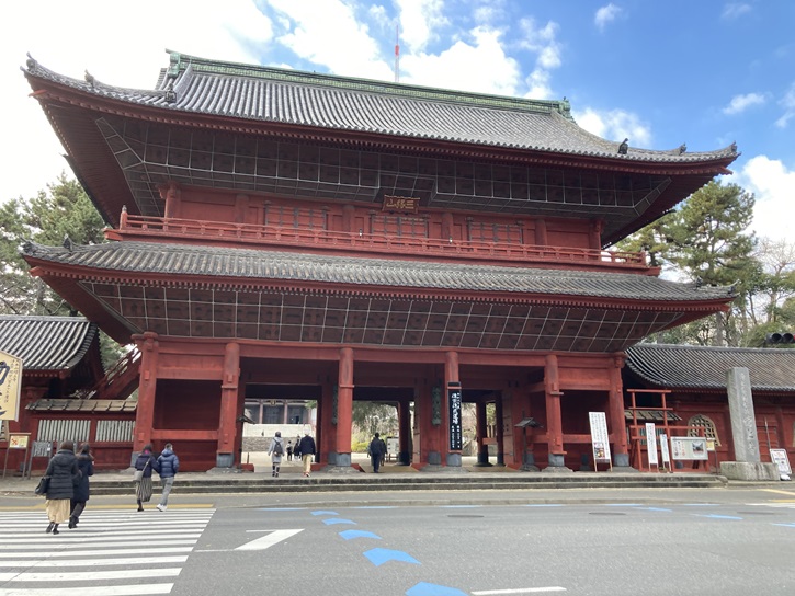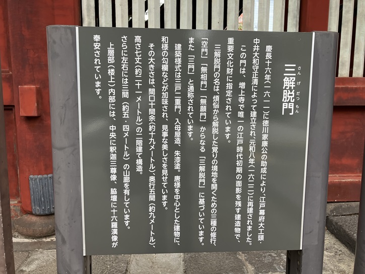 三解脱門は戦災を免れた建物のひとつで、元和八年(1622年)に建立された二重門(重層で、各層に屋根が付く門)です。この門を潜ると、三毒(3つの煩悩:貪・瞋・癡)から解脱できるとされています。内部には釈迦三尊像と十六羅漢像が安置されています。