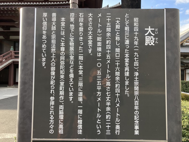昭和四十九年(1974年)、浄土宗開宗八百年の記念事業として戦災に遭った本堂を再建しました。「大殿」と称し、間口二十六間余(約48メートル)奥行二十五間余(約45メートル)高さ七丈半余(約23メートル)総面積は10、535平方メートルという大きさの大本堂です。石段を登りきった二階に本堂、三階に道場、一階に檀信徒控室、地下に宝物展示室などを備えています。本堂には、ご本尊の阿弥陀如来(室町期作)、両脇壇に高祖善導大師と宗祖法然上人の御像が祀られ、参拝される方々の厚い信仰をあつめています。