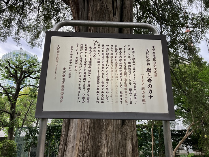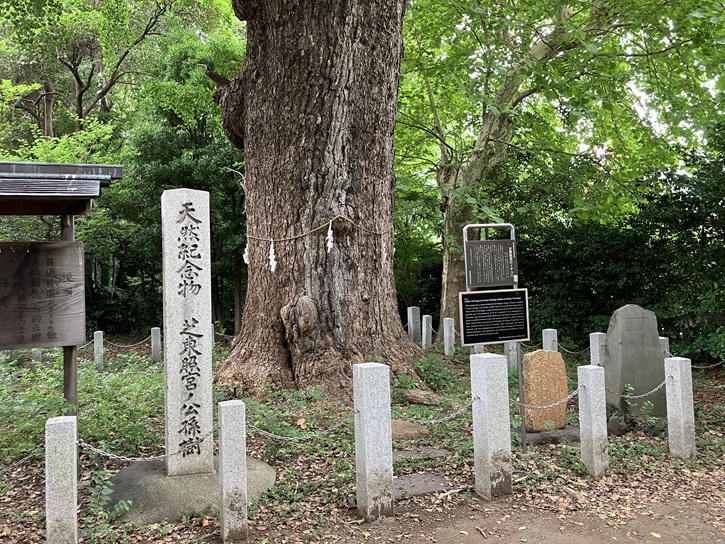 This ginkgo tree is believed that the 3rd Shogun, Iemitsu Tokugawa, planted it when Toshogu was rebuilt in 1641. This is one of the most giant trees in Tokyo with 21.5 m hight, a trunk circumference of 6.5 m (about 1.2 m above ground) and a circumference of 8.3 m at ground. It was designated as a secondary class monument (local monument) and national treasure by a law passed to protect historical sites and national treasures in 1930. In January 1656, based on the present law for Protection of Cultural Properties, it was once removed from the list of secondary class monuments and national treasures, and later designated again by the Tokyo ordinance of Protection of Cultural Properties. This ginkgo tree has witnessed the transition of Zojo-ji and Shiba park, which are located around.