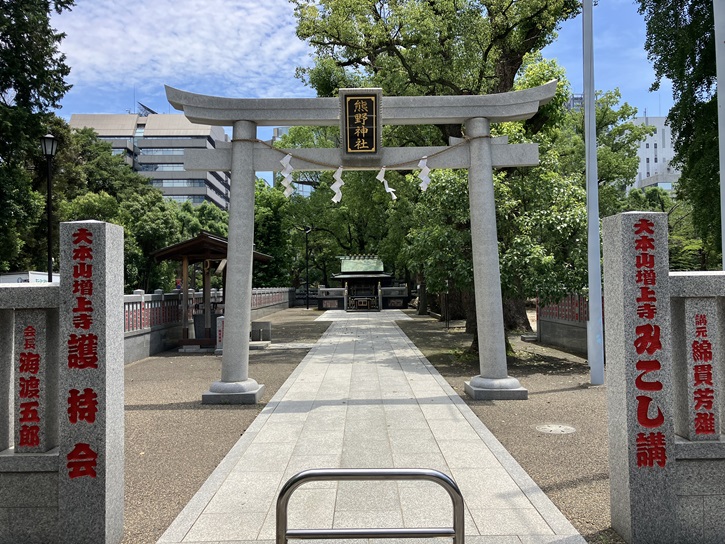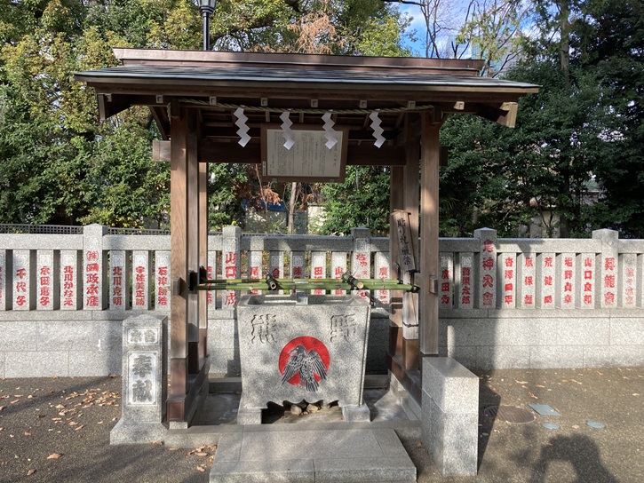 天皇の即位の礼に立てられるのぼりの紋様には八咫烏が使われたそうですし、また天皇の礼服の紋章には、日輪の中に八咫烏の刺繍が施されているそうです。近日身近なところでは、サッカー日本代表が着ているユニフォームの胸に付いておりますマークも八咫烏です。すなはち日本サッカー協会のシンボルマークとして用いられております。日本サッカーの成長と勝利への導きを願っております。私共大本山増上寺みこし講も、昭和四十九年に発足当時より八咫烏を代紋とさせて頂いております。お祭りの御神輿を通じて、結集した四百余名が大本山増上寺より護国豊穣、天下泰平を導いて頂きたいと祈願しております。このたび、みこし講発足三十年を記念して、熊野神社(境内)修復改修工事をさせて頂きました。今回の工事の際にみこし講の大柱の前に、この水舎に向かって三箇所の島の足跡(保存有)が付いていたという縁起のよい事がありました。当熊野神社にも本物の八咫鳥がいると信じてみこし講一同も八咫烏のお導きを頂いてより高い志をもって、一層の努力を心掛けてまいります。皆様のご多幸とご発展をお祈りいたします。