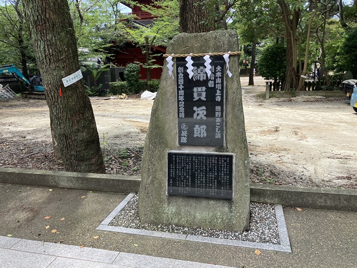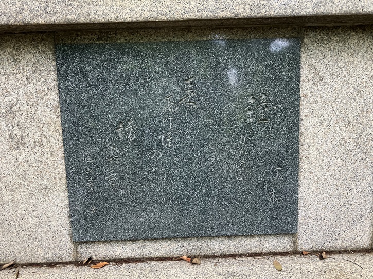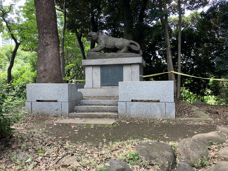 古墳の上の広場の西側隅に「虎」の石像があります。基部には「大野伴睦句碑」・「文揮毫 鳩山薫」の文字が読み取れます。大野伴睦は、衆議院議長や自民党副総裁を務めた大物政治家でした。碑には「鐘がなる春のあけぼのゝ増上寺」と刻まれています。ちなみに、大野伴睦の最も大きな功績は、東海道新幹線の建設で当初計画されたルートをねじ曲げ、選挙地盤の閑散とした地に「岐阜羽島駅」を誘致したことです。これがために、冬期になると関ヶ原で降雪のために新幹線が常に遅延するという問題に悩まれることになりました。