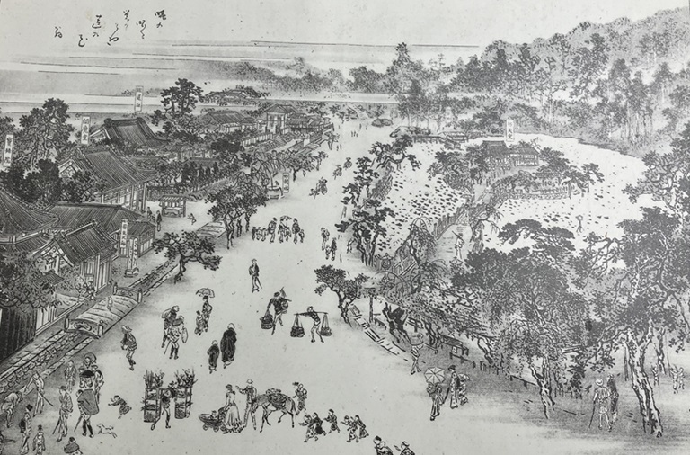 Even before the promulgation in 1873 of Order No.16 by the Great Council of State that created Shiba Park, there was an expansive pond called Benten-ike Pond located on the temple grounds of Zojo-ji to the rear west, around the southwest temple gate. In the summer a mix of red and white lotuses bloomed. It was the most picturesque of spots, with its pure, natural fragrances and deeply tranquil surroundings. Devotion to Benzaiten was encouraged during the stewardship of the 30th Abbot of Zojo-ji Reigen, and a shrine to Benzaiten was built on the islet in the middle of the pond. The seated statue of Benzaiten a little over 30 cm high. It is said to have been carved in the 9th century by Chisyo-daishi, was worshipped devoutly by Minamoto no Yoriitomo and the Hojo clan, and later moved to Zojo-ji by order of Tokugawa leyasu. On the island there is also a shrine to the Bodhisattva Myoken in his manifestation as the god Inari. Genyo Koki ("Official Chronicle of the Glory of the Current Era") states, "There is a pond at the foot of Mt. Maruyama, and around February the local peasants take turns soaking unhulled rice in it, so they built a small island in the middle of the pond and constructed a shrine to Inari." Both shrines were present on the islet up to the Meiji Restoration, but they are currently housed in the neighboring Hoshu-in Temple. Benzaiten is now revered as one of the Seven Gods of Fortune enshrined across Minato City. Benten-ike Pond has been known by different names. It is said that long ago it was called "Sayo-ga-Ike" after a woman named Sayo who ended her life by jumping into the pond. Another name was "Yuri-ga-Fuchi". The stone bridge to the island is called Setsuren-kyo ("Bridge Touching the Lotuses") and Fuyo-bashi Bridge ("Cotton Rose Bridge"), both names of which are said to have been conferred by Reigen.