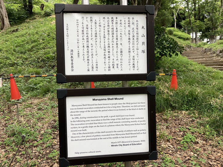 丸山貝塚は明治時代から知られていましたが、長い間、正式な調査は行われず、貝塚の範囲や形成時期、貝塚を構成する貝種などはわかっていませんでした。平成八年(1996年)、公園内で行われた工事の際に良好な貝層が発見されたため、翌年、範囲等の確認調査が行われました。その結果、丸山古墳が築造された台地の裾の緩やかな傾斜地に、マガキを主体とする貝塚が形成されていたことが明らかになりました。土器などの遺物が少ないことが、この貝塚の特徴でもありますが、わずかに出土した土器片から、貝塚の形成時期は縄文時代中期末から後期である可能性が高いと考えられます。