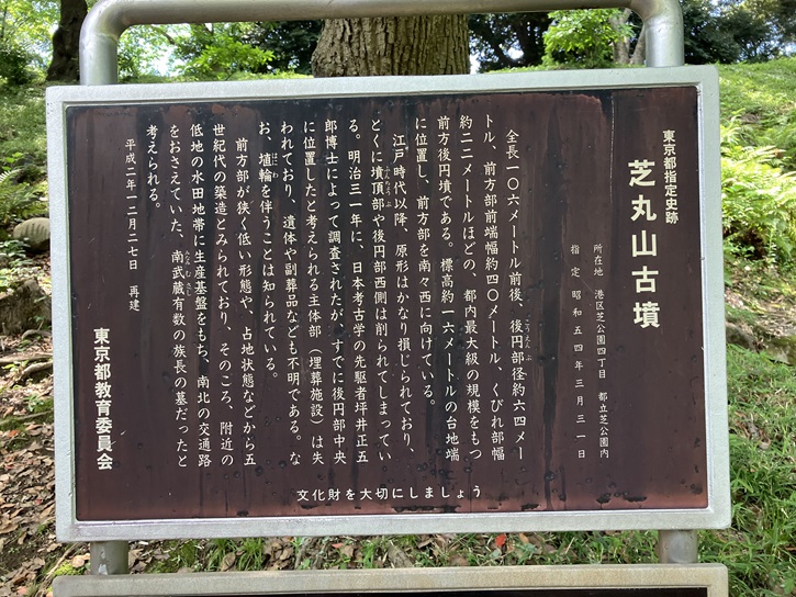 芝丸山古墳は、芝公園内の標高約16メートルの台地先端部に位置し、前方部を南南西に向ける前方後円墳です。築造は5世紀中頃過ぎ(4世紀後半との説もある)とみられ、墳丘長125メートル(案内板では106メートル前後)という都内では最大級の規模です。江戸時代に後円部頂が崩され、広場になっていたと考えられています。