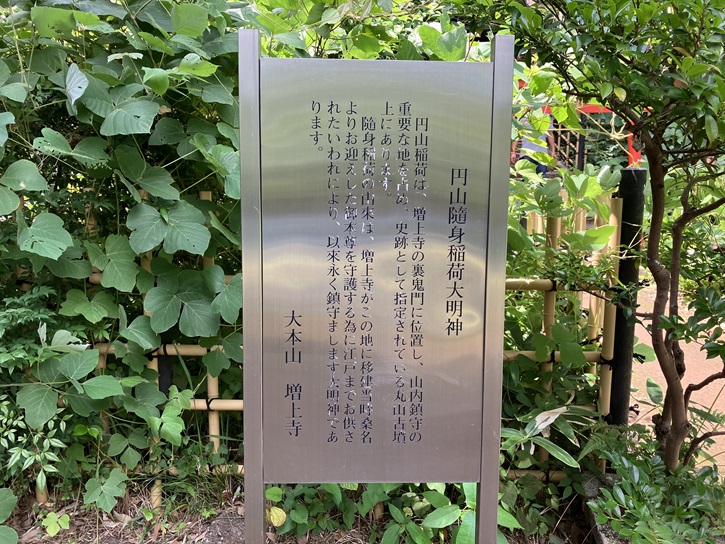 円山稲荷は、増上寺の裏鬼門に位置し、山内鎮守の重要な地を占め、史跡として指定されている丸山古墳上にあります。随身稲荷の由来は、増上寺がこの地に移建当時桑名よりお迎えした御本尊を守護する為に江戸までお供されたいわれにより、以来永く鎮守まします大明神であります。