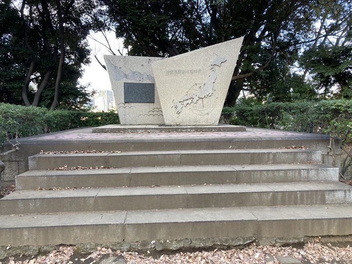 広場の中央の小高い場所に、「伊能忠敬測地遺功表の碑」が建っています。最初の碑は、明治二十二年に、初めて日本地図を作った測量の先駆者である伊能忠敬の功績を顕彰して、東京地学協会が建てました。しかし、戦災で碑は失われ、現在の碑は昭和四十年に再建されたものです。
