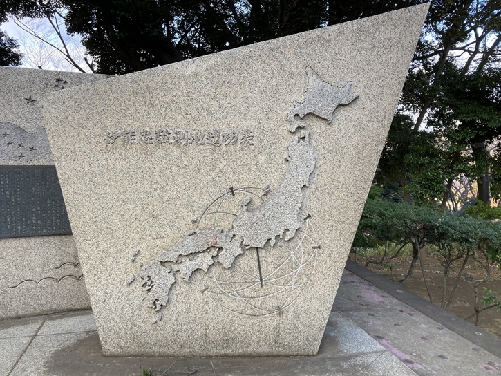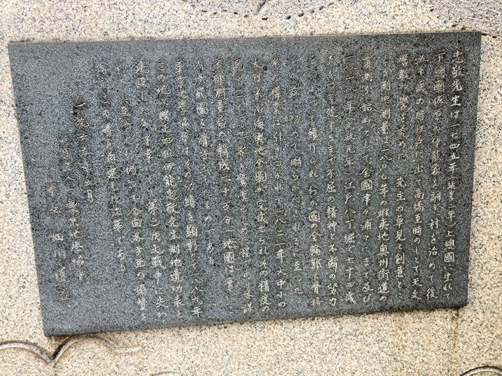 右側の碑には、日本全図と測量に使ったであろう天球儀(渾天儀)を組み合わせた図が描かれています。左側の碑には、東京地学協会会長の碑文が記されています。