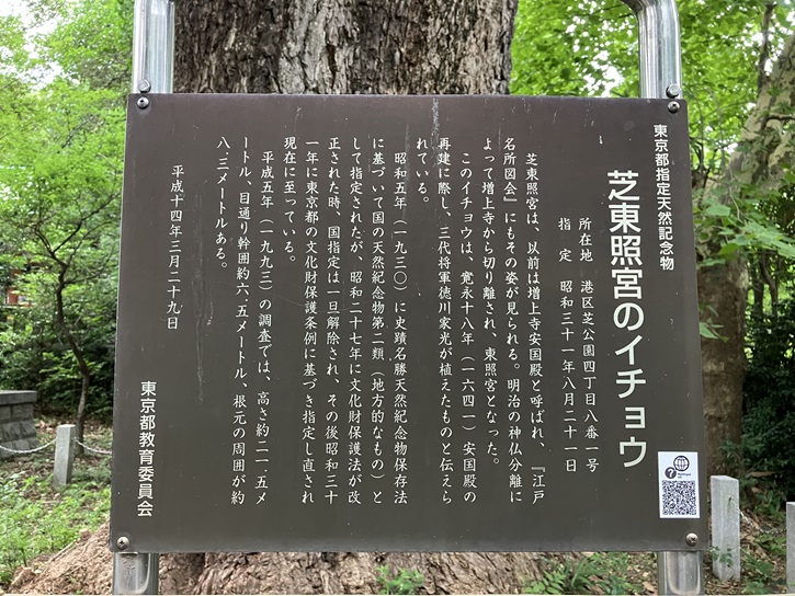 芝東照宮は、以前は増上寺安国殿と呼ばれ、「江戸名所図会」にもその姿が見られる。明治の神仏分離によって増上寺から切り離され、東照宮となった。このイチョウは、寛永十八年(1641年)安国殿の再建に際し、三代将軍徳川家光が植えたものと伝えられている。昭和五年(1930年)に史蹟名勝天然記念物保存法に基づいて国の天然記念物第二類(地方的なもの)として指定されたが、昭和二十七年に文化財保護法が改正された時、国指定は一旦解除され、その後昭和三十一年に東京都の文化財保護条例に基づき指定し直され現在に至っている。平成五年(1993年)の調査では、高さ約21.5メートル、目通り幹囲約6.5メートル、根元の周囲が約8.3メートルある。