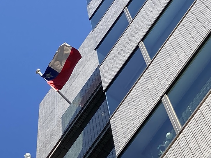 桜田通りの交差点の北東角のオフィスビルの上層階に旗がひらめいています。この旗がチリの国旗だと分かる方はかなりの地理(駄洒落)通でしょう。