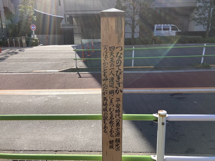 つなのてびきざか 平安時代の勇士源頼光の四天王の一人、渡辺綱(わたなべのつな)にまつわる名称である。姥坂(うばざか)とも呼んだが、馬場坂の説もある。