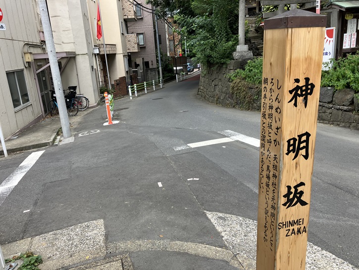 しんめいざか 天祖神社を元神明というところから神明坂と呼んだ。馬場坂という説もあるが、綱の手引坂との混同があるらしい。