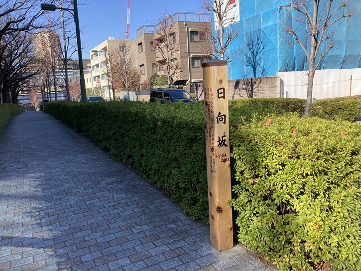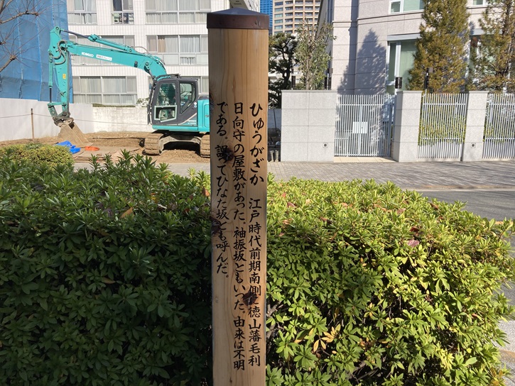 ひゅうがざか 江戸時代前期南側に徳山藩毛利日向守の屋敷があった。袖振坂ともいった。由来は不明である。誤ってひなた坂とも呼んだ。