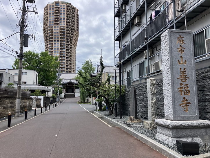 善福寺は、都内では浅草寺、深大寺に次ぐ古刹のひとつで、境内には福沢諭吉など著名人の墓も多くあります。安政五年(1859年)には、日米修好通商条約に基づき、寺院内がタウンゼント・ハリスら一行の宿舎となり、一室が初代アメリカ合衆国公使館として使われました。万延元年(1861年)には、ハリスの通訳だったヒュースケンが公使館へ戻る際に暗殺され、善福寺内に運ばれて亡くなりました。参道の先に奇妙な形状をした建物が聳えています。元麻布ヒルズフォレストタワー(高所得者向けマンション)の形状は樹木をイメージしています。高さ約96m地上29階のタワーが閑静な住宅街に建つことによって、影やビル風で住民の住環境に害を及ぼす可能性がありました。そこで20階以上の部分の幅を約40m、16階より下の幅を約33mという「頭でっかちで下半身スリム」な形が採用されました。この形にすることで、高層ビルにつきまとう影とビル風という2つの大きな環境問題が解決されました。また下部を細くすることで敷地に樹木が植えられる広いスペースが生まれました。建物の形状から「耐震構造」ではなく、建物と基礎の間の免震装置を介してエネルギーを減衰させる「免震構造」が採用されています。ちなみに、元麻布ヒルズフォレストタワーの敷地は元々は善福寺の所有地でしたが、バブル景気直前の1983年に森ビルが譲り受けてタワーが建設されました。
