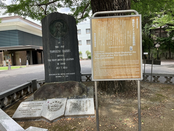 本堂前の広場に、「アメリカ公使宿館跡」の記念碑があります。