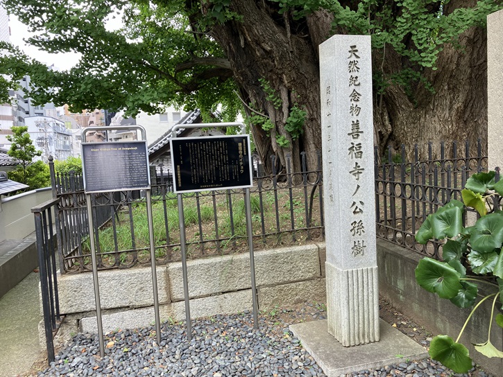 イチョウ(銀杏・公孫樹)は、中国原産のイチョウ科の落葉高木である。雌雄異株で、神社や寺院の境内樹・公園樹・庭園樹・街路樹として広く植栽されている。四月に開花し、雌株は十月に種子(イチョウの実)が成熟して独特の臭気を放ち、黄葉する。この木は雄株で、幹の上部が既に損なわれているが、幹周りは10.4メートルあり、都内のイチョウの中で最大の巨樹である。樹令は750年以上と推定される。善福寺は、昭和二十年の東京大空襲によって本堂が全焼した際、このイチョウの木にもかなり被害があったが、いまなお往時の偉観をうかがうことができる。根がせり上がって、枝先が下にのびているところがら「逆さイチョウ」ともいわれ、また、親鸞聖人が地に差した杖から成長したとの伝説から「杖イチョウ」の別名もある。