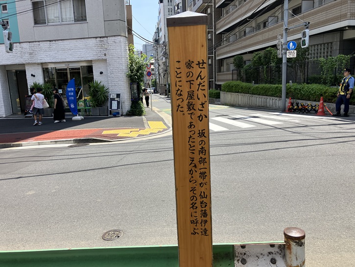 せんだいざか 坂の南部一帯が仙台藩伊達家の下屋敷であったところから、その名に呼ぶことになった。