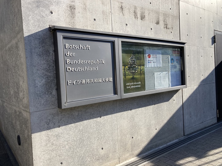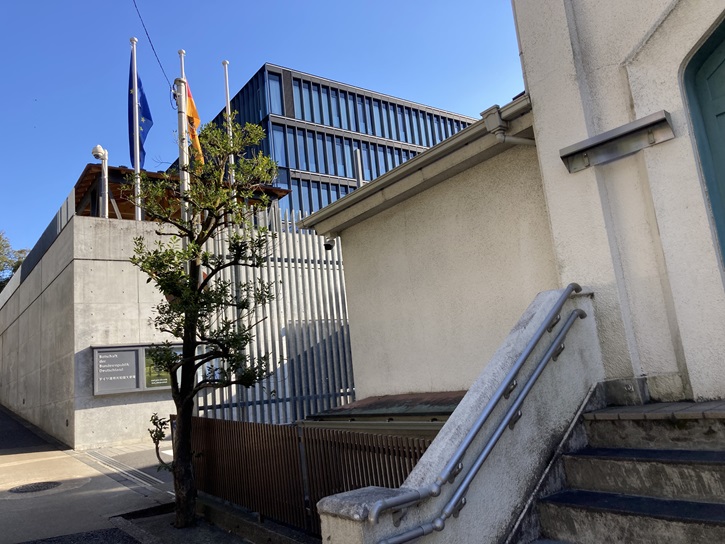 南部坂の南側にドイツ大使館があります。現在のドイツ大使館が位置する一帯は、江戸時代初期は「広尾」という地名でした。明治時代になっても、「土筆(つくし)が岡」と呼ばれるほど武蔵野の面影を残す野趣に富んだところでした。大使館は武蔵野台地の先端部に位置し、大使公邸から南の部分は急斜面になっています。江戸時代には斜面の場所に「麻布御薬園」が置かれ、五代将軍綱吉は別荘となる「白銀御殿」を造営させました。富士山が望めたことから「富士見御殿」とも呼ばれていました。現在も近くに「富士見坂」という坂名が残っています。江戸時代には、現在の大使館敷地は武家地でしたが、明治時代に入ると一時期この場所には海軍の懲罰施設「海軍囚獄処」が置かれていました。大正時代には、政治家で政友会の重鎮だった小泉策太郎が現在の大使館が建っている敷地に接客用の洋館と居住用の和館から成る邸宅を建て、庭園を築きました。小泉の没後、日本タイプライター会社の創設者で衆議院議員の桜井兵五郎が終戦時までここに邸宅を構えました。戦後、不動産は康楽寺に委ねられ、一時期は中国大使館の施設としても利用されていました。最初の駐日ドイツ領事館は、文久二年(1862年)に横浜市に開設され、その4年後に麻布の春桃院に移設されました。その後、明治五年(1872年)から昭和二十年(1945年)にかけて、永田町に公使館(1906年以降は大使館)が設置されました。昭和二十年(1945年)5月の空襲で大使館は焼失し、戦後は他のドイツ関連資産と同様に、大使館の土地もGHQの接収対象となりました。国会議事堂の隣にあるこの場所には、現在国立国会図書館が建っています。その後、昭和二十七年(1952年)から昭和三十五年(1960年)にかけて、大使館は麻布東鳥居坂町(現在の六本木5丁目)に置かれました。昭和二十九年(1954年)、日本政府から戦前のドイツ大使館敷地に対する一種の代替地として、現在の港区南麻布の土地を1円という名目的な価格で取得することについて打診がなされました。当時この土地には中華民国(台湾)大使館の官舎が建っていました。その2年後、面積約14、500平米の敷地に大使館事務棟と大使公邸を建設する作業がスタートしました。事務棟も公邸も現代建築の粋を集めたものでした。竣工と入居は大使公邸が1957年、事務棟は1960年でした。事務棟内部の吹き抜けの階段室には、1階から最上階にまで達する南向き全面にガラスブロックの部材をふんだんに使った明かり取りが設けられていました。ルーフ部分の軽やかな反り屋根は西洋的な機能主義と東洋的建築意匠の伝統の組み合わせを表現していました。1995年の阪神淡路大震災後、大使館事務棟と大使公邸の耐震性検査が行われ、事務棟は新築が必要であるとの結論が出されました。新事務棟の基本設計選定にあたっては国際コンペが実施され、5階建てキューブ型(箱形)の建物を提案したマーラー・ギュンスター・フクス設計事務所が当選しました。開放的で透明性が高い一方で、質実剛健なデザインでもあります。