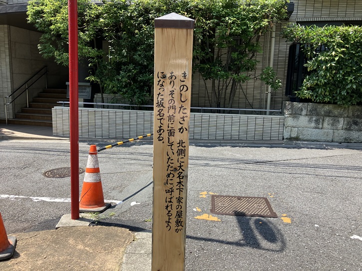 きのしたざか 北側に大名木下家の屋敷があり、その門前に面していたために、呼ばれるようになった坂名である。