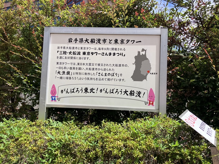 岩手県大船渡市と東京タワーは、毎年9月に開催される「三陸・大船渡 東京タワーさんままつり」を通じ友好関係にあります。東京タワーでは、東日本大震災で被災された大船渡市の、一日も早い復興を願い、大船渡市から送られた「大漁旗」と特別に制作した「さんまのぼり」を「一緒に頑張ろう!」という気持ちを込めて掲げています。