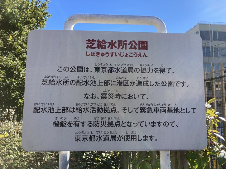 この公園は、東京都水道局の協力を得て、芝給水所の配水池上部に港区が造成した公園です。なお、震災時において、配水池上部は給水活動拠点、そして緊急車両基地として機能を有する防災拠点となっていますので、東京都水道局が使用します。