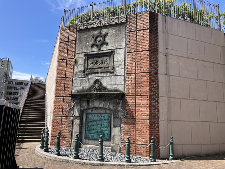 旧芝給水所の正門も残されています。構内にも幾つか遺構が残されているそうですが、門が閉っていて見れませんでした。モニュメントがあったのは、流入弁室の外壁だったようです。