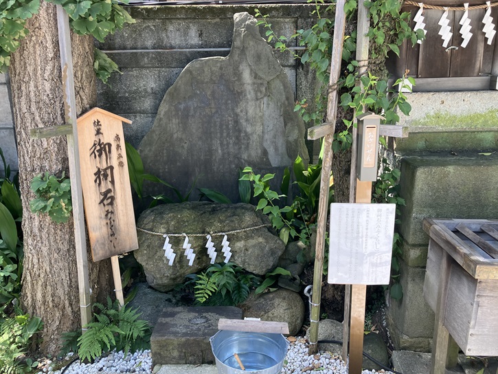 由来は増上寺観智国師夢に告あり、翌朝社頭に神拝の折、この石に腰を掛け誓約の事あり、この石に水を注ぎ心願する時はいかなる熱病もたちまち癒えるという。