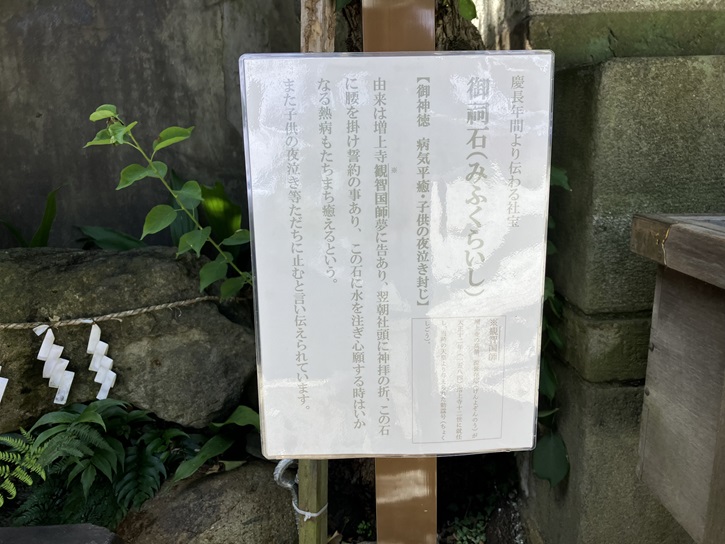 慶長年間から伝わる社宝が御祠石(みふくらいし)です。その由来を記した案内板が立っています。