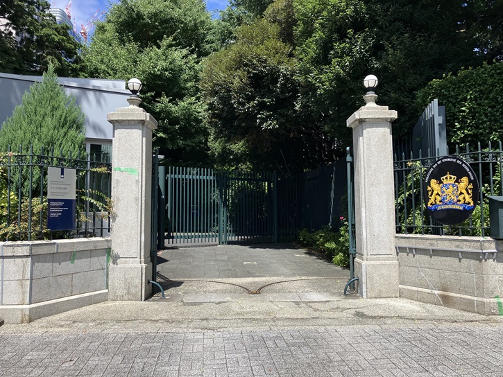 オランダ王国大使館は、大使公邸の左手にあります。門の奥には鬱蒼とした樹木が生い茂っていて、他国の大使館とは趣が異なっています。
