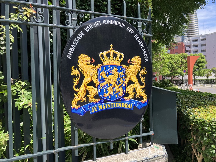 門の両側に大使館の標識と金色のライオンがデザインされたオランダ王国の紋章が掲げられています。プジョーのエンブレムに似ていますね。
