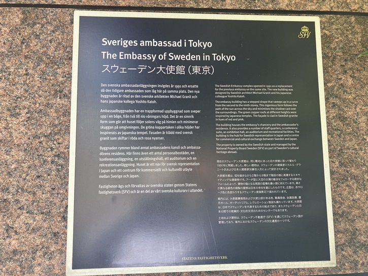 Den svenska ambassadanlaggningen invigdes ar 1991 och ersatte da den tidigare ambassaden som lag har pa samma plats. Den nya byggnaden ar ritad av den svenske arkitekten Michael Granit och hans japanske kollega Yoshito Katoh. Ambassadbyggnaden har en trappformad uppbyggnad som sveper upp i en bage, fran tva till nio vaningars hojd. Det ar en sinnrik form som gor att huset foljer solens vag pa himlen och minimerar skuggan pa omgivningen. De grona koppartaken i olika hojder har