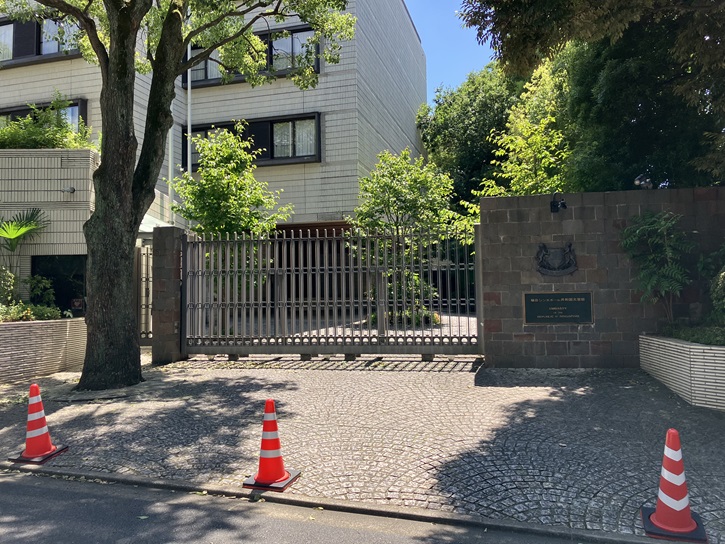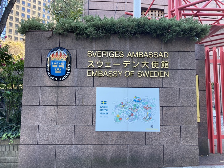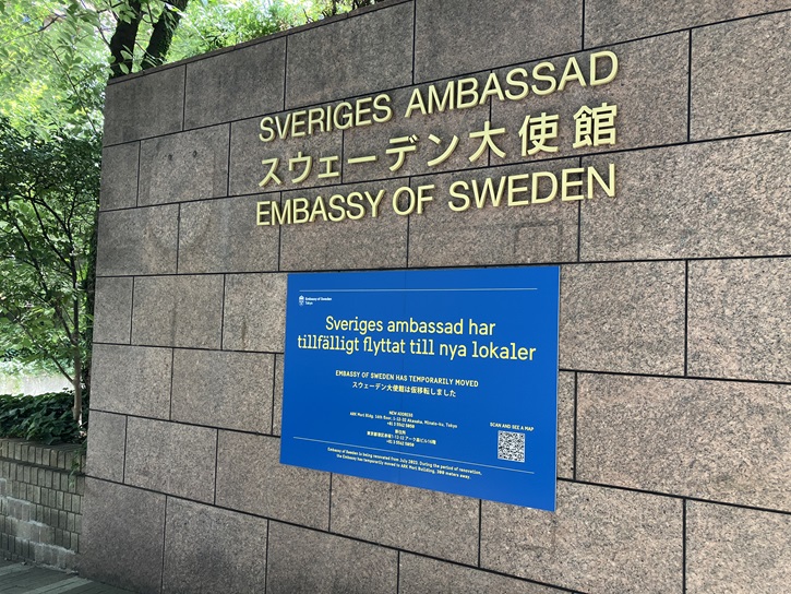 大使館は、改修工事のために2023年7月20日からアーク森ビル16階に仮事務所が置かれています。そのためか、スウェーデン王国の紋章も取り外されています。仮事務所に移されたのでしょうか?