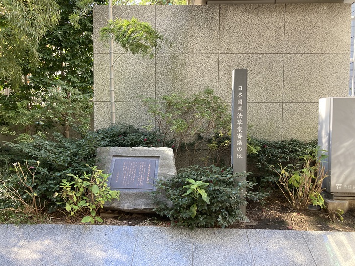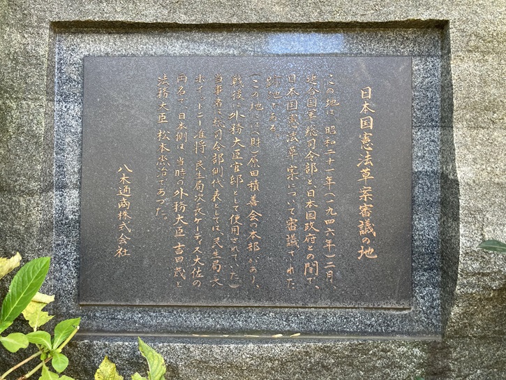 この地は、昭和二十一年(1946年)二月、連合国軍総司令部と、日本国政府との間で、日本国憲法草案について審議された跡地である。(この地には(財)原田積善会の本部があり、戦後に外務大臣官邸として使用されていた。)当事者は、総司令部側代表としては、民生局長ホイットニー准将、民生局次長ケーティス大佐の両名で、日本側は、当時の外務大臣吉田茂と法務大臣松本烝治であった。