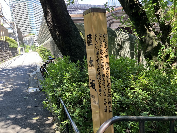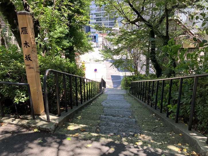 がんぎざか 階段になった坂を一般に雁木坂というが、敷石が直角に組まれていたことから等ともいい、当て字で岩岐坂とも書く。