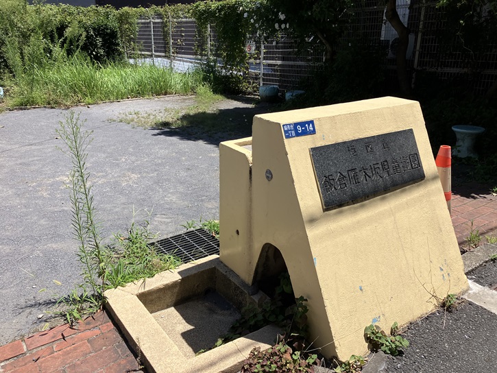 倉雁木坂児童遊園は、各国の大使館やオフィスなどが建ち並ぶ都会の真ん中の細い路地の中にある小さな公園で、ビルとビルの谷間にあるスペースをうまく整備して造られています。遊具などは何もなく、住宅地の一画にある空き地のような感じです。公園の名前が記された石柱の裏側に水道の蛇口がある珍しいデザインが目を引きます。公園内にはベンチ(腰掛け石)だけが設置されていますが、水道とベンチは同じ色で統一されたデザインになっています。