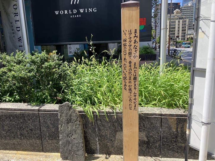 まみあなざか まみとは雌ダヌキ・ムササビまたはアナグマの類で、昔その穴(まぶ)が坂下にあったという。採鉱の穴であったという説もある。