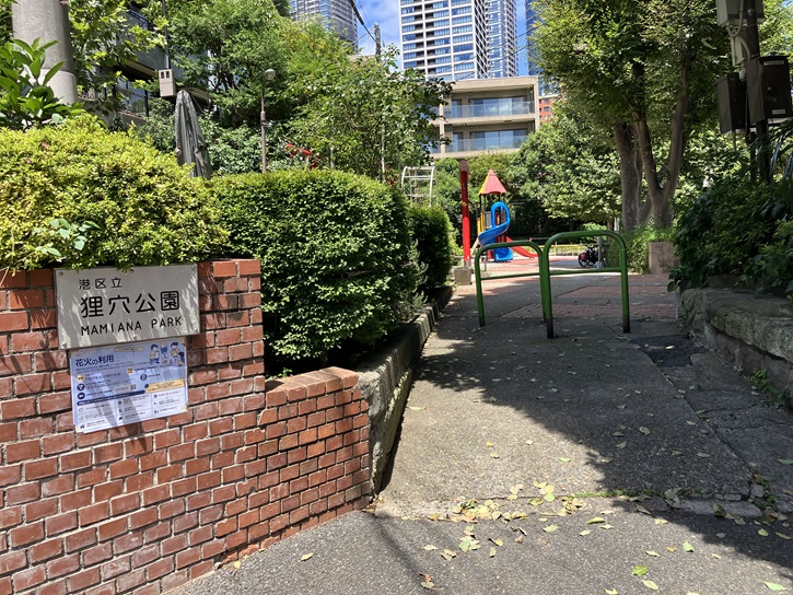 最も分かりやすいのは、外苑東通りに面したロシア大使館の向かいの路地から公園を目指すことです。といっても、この路地は駐車場と民家に挟まれた極狭の通路なんですが。