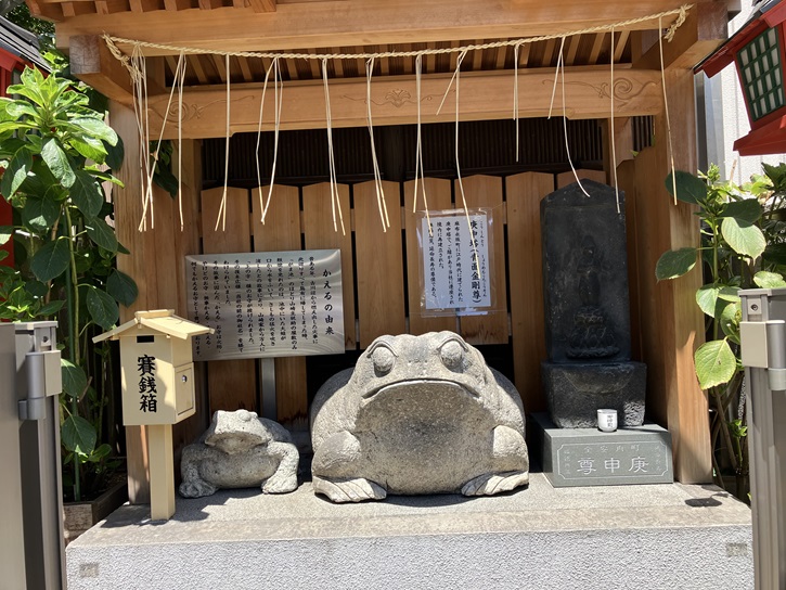 文政四年(1821年)7月2日の大火によって周辺地域が焼失した際、元麻布にあった備中成羽藩主山崎家の屋敷だけは類焼を免れ、それは屋敷内にあるがま池の大ガマが火を防いだからだと信じられ、人々に求められて山崎家は「上」という一字が書かれた御札を万人に授けるようになりました。この御札は「上の字様」と称され、防火・火傷のお守りとして信仰を集めました。「上の字様」は後に十番稲荷神社の前身である末広神社を通して授与されるようになりましたが、空襲による社殿焼失後の戦後には中断していました。しかし、「上の字様」の復活を願う声は多く、昭和五十年(1975年)8月から、代わりとして「かえるのお守り」の授与を開始し、かえるの石像も奉納されました。その後、「上の字様」も神社に伝わる史料を基に、ほぼそのままの姿で復刻し、平成二十年(2008年)元旦から授与を開始しました。
