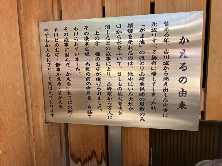 昔ある年、古川辺から燃え出した火事に此辺りすべて烏有に帰してしまった時、「がま池」のほとり山崎主税助の屋敷のみ類焼を免れたのは、池中にいた大蛙が口から水をふいて、さしもの猛火を吹き消したとの故事により、山崎家から万人に「上の字」様のお守が授けられました。その後末広様(当社の前の御社名)を経てわけられていました。その故事に因んだ「かえる」お守は火防・やけどのお守・無事かえる・若がえる・何でもかえるお守として貴ばれております。