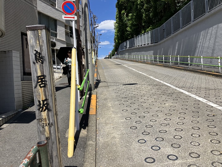 都道319号環状三号線の鳥居坂下交差点から急坂が上っています。鳥居坂は長さが約90mほどの急な坂です。別名を「鳥井坂」といいます。坂名の由来は、元禄時代に坂の東側に大名鳥居家の屋敷があったことに因んでいます。