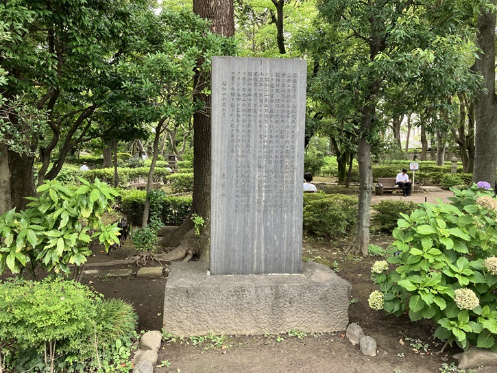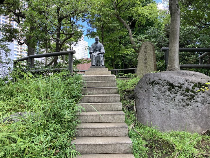 庭園スペース奥の築山には、高橋是清の銅像が建てられています。記念公園が開園した1941年に初代の銅像が建てられましたが戦時中に失われ、現在あるのは1955年に建てられたものです。初代は洋装で現在は和装の姿ですが、どちらも制作者は彫刻家の齋藤素巌です。石碑には、高橋是清の業績と公園設立の経緯について記されています。