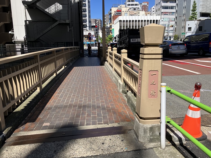 古川を一之橋で渡ります。一之橋は、長さ16.4m・幅22.0m・車道16.5m・歩道2.0m(両側)で、昭和五十八年1月に架替えられました。白金御殿の造営にともなう古川の改修により架けられたといわれ、橋名は、元禄十二年(1699年)8月に古川に始めて架けられた橋ということに因んでいます。