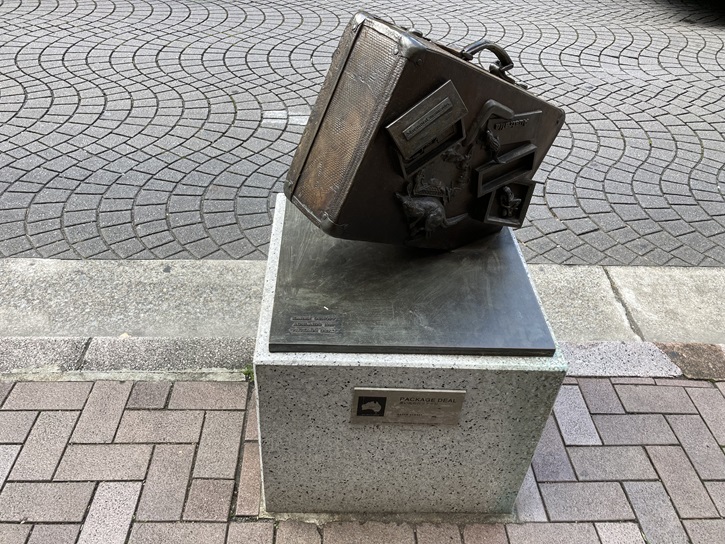 「思い出のパッケージ」は、オーストラリアの芸術家の作品です。作者の解説では、「この作品は、土着の動植物がみやげ物として濫用される現状への問題提起という面を持っています。」とのことです。確かに、スーツケースの側面には、カンガルーとか小動物の浮き彫りがされています。