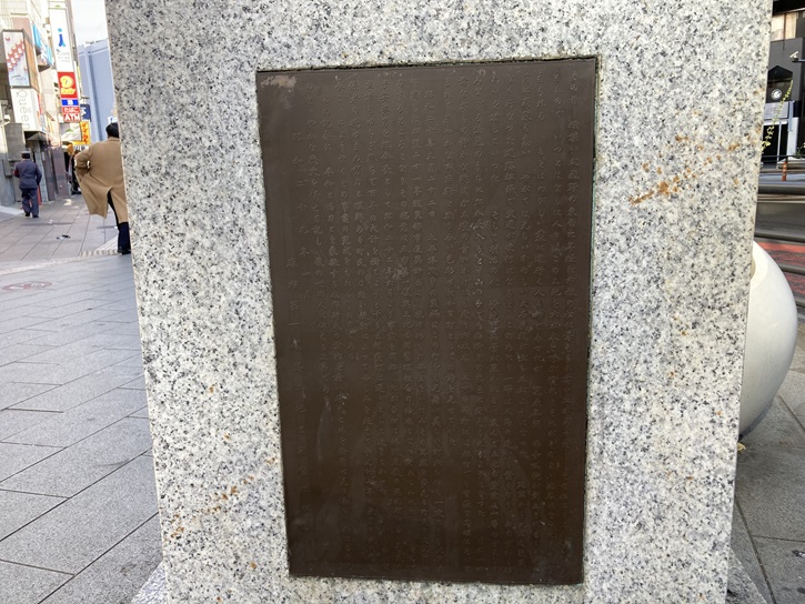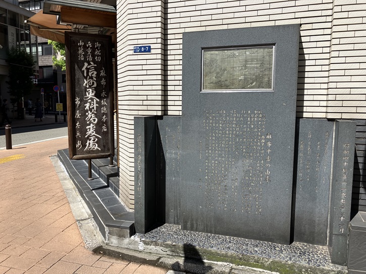 300年以上の歴史を誇る麻布十番商店街には、蕎麦の「永坂更科布屋太兵衛麻布総本店」や豆菓子の「豆源麻布十番本店」、たい焼きの「浪花家総本店」など、老舗の店が多く営業を続けています。近年は話題の新しい店も増え、さらに魅力を増しています。永坂更科布屋太兵衛麻布総本店は、第十一代将軍徳川家斉治世の寛政年間の頃、初代布屋太兵衛が江戸麻布永坂で看板を掲げたのが始まりといわれています。それより以前の元禄の初めに、太物商を商っていた布屋清助が領主保科兵部少輔に招かれて江戸屋敷内(当時の麻布十番長屋)に住まうようになりました。代々蕎麦打に長じていたことから、八代目清右衛(初代布屋太兵衛)は領主の勧めで故郷の更級郡の「更」と領主保科家の「科」を賜り、それに永坂の地名をつけ加え、「永坂更科」と命名したのが屋号となっています。蕎麦の旨さを際立てさせる拘り製法の濃厚なつゆは、あま汁とから汁の2種類を用意していて、毎日職人が片時も離れず丁寧に仕込んでいます。そのままでもおいしいのですが、自分好みの味にブレンドして食すのもお勧めです。お店の入口の横に、「麻布十番の由来」と記された石板が建っています。両脇には、麻布の風景を詠んだ川柳も並んでいます。