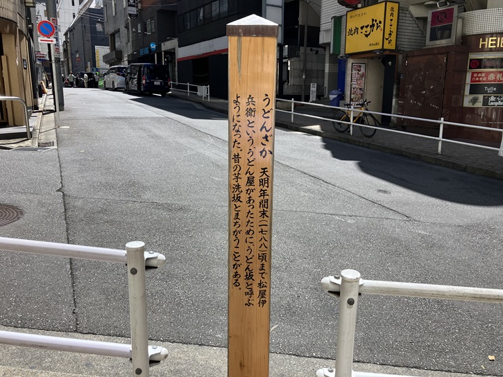 うどんざか 天明年間末(1788年)頃まで松屋伊兵衛という、うどん屋があったために、うどん坂と呼ぶようになった。昔の芋洗坂とまちがうことがある。