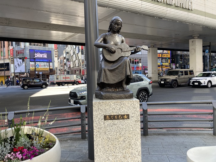 六本木交差点の角にギターを奏でる乙女のブロンズ像が置かれています。昭和二十年、終戦と共に戦争の爪痕は六本木の地にも深く残りました。ようやく訪れた平和ではありましたが、やるべきことは山積みです。終戦と時を同じくして六本木の復興計画は幕を開けました。建物の移転や道路・公園・水道などのインフラ整備、これらの整備にやっと一区切りがついたのは終戦から9年が経った昭和二十九年のことでした。区画整理事業が完了して街としての機能が備わり、その記念碑として建てられたのが「奏でる乙女」の像でした。当時はもちろん首都高速はありませんでした。六本木通りの中央には緑地帯があり、当初「奏でる乙女」の像はその緑地帯に建てられました。昭和三十七年に地下鉄日比谷線の工事が始まったために近隣の三河台公園に移転しました。このとき、不幸にも腕などの一部が壊されてしまう憂き目に遭いましたが、この像を守り抜きたいという想いを強くした関係者の尽力により昭和五十年に再建されました。当初のセメント製からより堅強なブロンズ製に変わって再び六本木交差点へ移転されましたが、1990年代後半に差し掛かると、次は都営地下鉄大江戸線の工事で再び移転を余儀なくされました。平成十二年になってようやく元の場所に還ってきました。