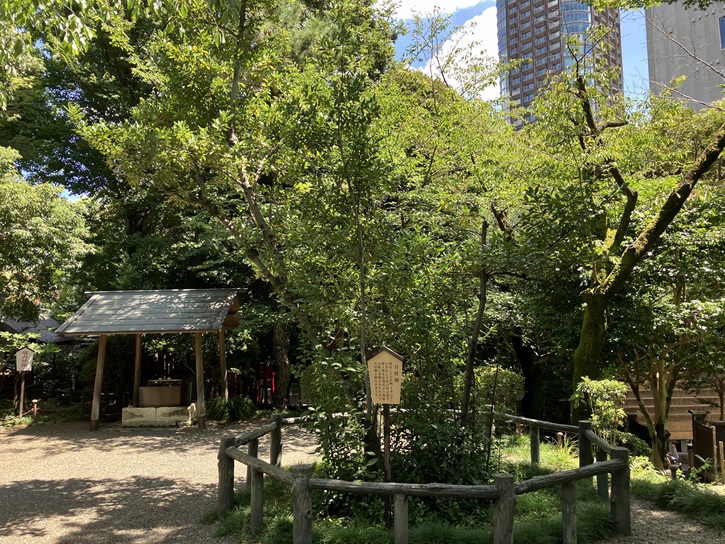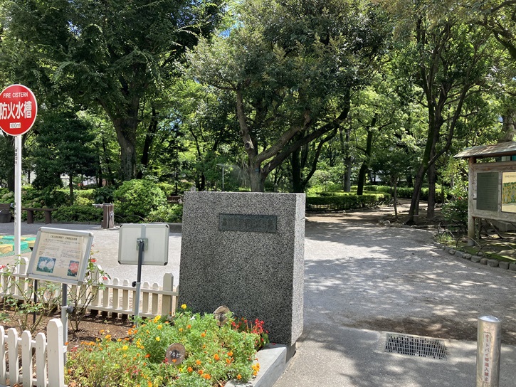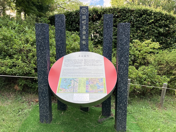 公園の一画に、「赤坂檜町」の旧町名由来板が建っています。