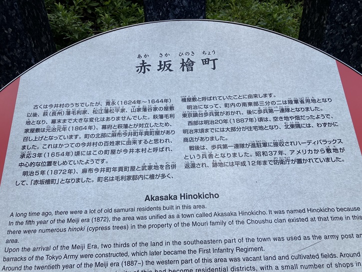 A long time ago, there were a lot of old samurai residents built in this area. In the fifth year of the Meiji era (1872), the area was unified as a town called Akasaka Hinokicho. It was named Hinokicho because there were numerous hinoki (cypress trees) in the property of the Mouri family of the Choushu clan existed at that time in this