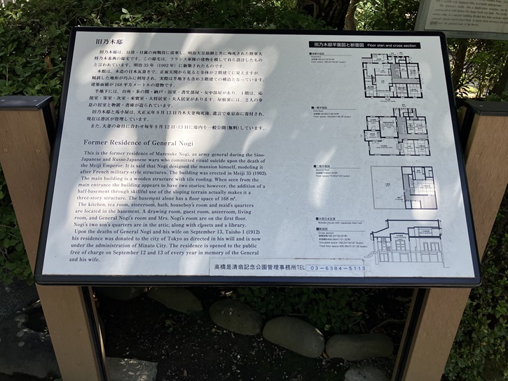 Japanese and Russo-Japanese wars who committed ritual suicide upon the death of the Meiji Emperor. It is said that Nogi designed the mansion himself, modeling it after French military-style structures. The building was erected in Meiji 35 (1902). The main building is a wooden structure with tile roofing. When seen from the main entrance the building appears to have two stories; however, the addition of a half-basement through skillful use of the sloping terrain actually makes it a three-story structure. The basement alone has a floor space of 168 square meter. The kitchen, tea room, storeroom, bath, houseboy's room and maid's quarters are located in the basement. A drawing room, guest room, anterroom, living room, and General Nogi's room and Mrs. Nogi's room are on the first floor. Nogi's two son's quarters are in the attic, along with closets and a library. Upon the deaths of General Nogi and his wife on September 13, Taisho 1 (1912) his residence was donated to the city of Tokyo as directed in his will and is now under the administration of Minato City. The residence is opened to the public free of charge on September 12 and 13 of every year in memory of the General and his wife.