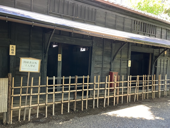 乃木希典大將は馬をこよなく愛し、旅順陥落後に旅順要塞司令官のステッセリ将軍から贈られて愛馬となった「壽号(すごう=ステッセリから「ス」を採っての命名)」、明治天皇が崩御後の宮中殯宮に参殿し通夜の際に騎乗した副馬の「璞号(あらたまごう)」、明治三十四年に馬匹改良のため高知県に寄贈し高知県生産馬の品質向上に貢献した「轟号」、日高牧場で生まれて明治二十六年に乃木大將が購入し旅順攻略でも前線に帯同した「雷号(いかずちごう)」などが知られています。馬小屋には、「壽號」と「璞號」の表札が残っています。