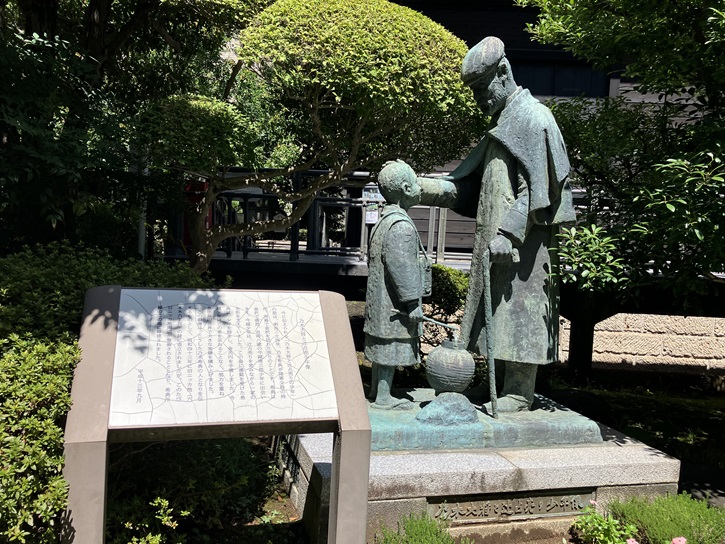 旧乃木邸には幾つかのモニュメントが置かれています。「乃木大将と辻占売少年像」は、1891年に用務で乃木大将が金沢を訪ねた際、辻占売りを営みながら一家の生計を支えていた今越清三郎という少年に出会い、この少年に感銘して2円を渡したというエピソードを銅像化し、1968年に乃木大将生誕の地(六本木ヒルズにある毛利庭園)に設置されたものです。しかし、六本木ヒルズ建設の際に旧乃木邸へ移設されました。ちなみに、その少年はその後金箔加工の世界で名を成したという逸話があります。